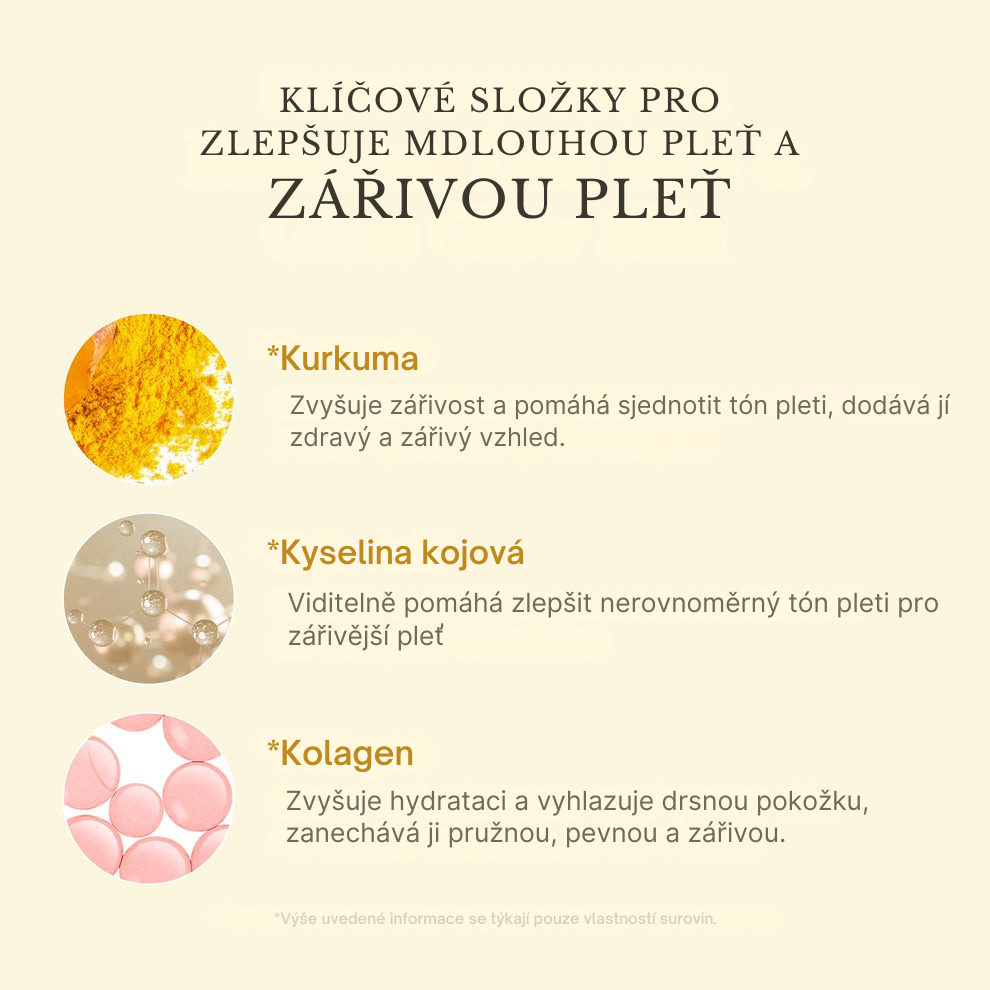 Kolagen zpevňuje pleť, kurkuma a vitamín C rozzáří tón pleti, zatímco retinol jemně působí na vyhlazení vrásek.
